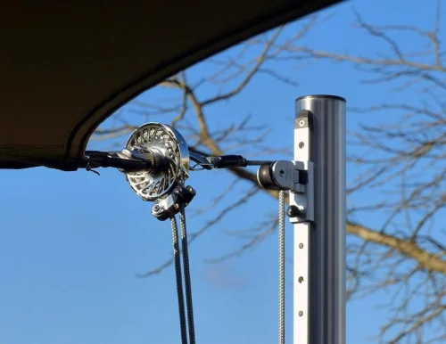 An den Pfosten lassen sich die Umlenkpunkte des Segels und der Wickelachse mittels eines Schlittens in der Höhe einstellen. Damit können Sie das Sonnensegel auch bei tieferstehender Sonne so ausrichten, dass es den gewünschten Schatten erzeugt. Segelflächen bis ca. 50 m² lassen sich mit diesem System mühelos realisieren.